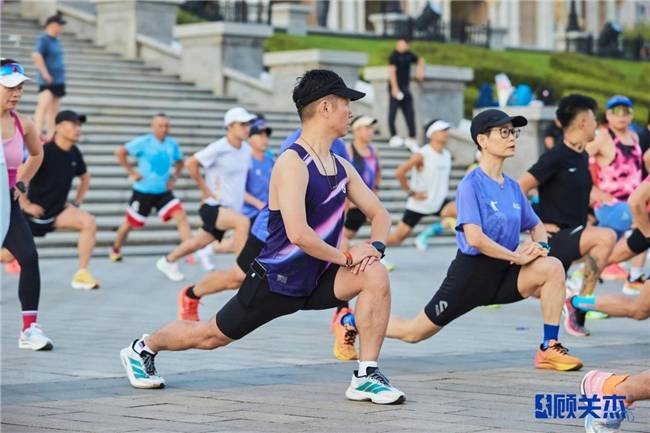 開跑前,顧關杰組織集體拉伸,并為跑者分發(fā)顧關杰氨糖霜,指導大家在膝關節(jié)、腳踝等易受傷部位涂抹。由于北方晝夜溫差大,關節(jié)容易受涼僵硬,專業(yè)養(yǎng)護搭配高抬腿、弓步走等動作,可有效預防運動損傷。這條路線,讓跑者在“江風穿廊過,音符伴步頻”的意境中沉浸。其循序漸進的節(jié)奏,能引導身體精準找到發(fā)力狀態(tài)。在開闊的景致中,每一次深呼吸,都是為賽前狀態(tài)“充能”的最佳方式。開跑前的集體拉伸環(huán)節(jié),顧關杰為大家分發(fā)了顧關杰氨糖霜進行專業(yè)養(yǎng)護 —— 北方晝夜溫差大,關節(jié)易因受涼發(fā)緊,大家在膝關節(jié)、腳踝等部位仔細涂抹,配合高抬腿、弓步走等科學動作,能更好地防止運動損傷。